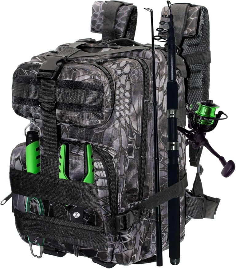 - Organization System and Fishing Rod Holder: In order to improve efficiency, this fishing backpack with rod holder has a webbing system can store pliers, bass bait, hunting knives, poles and all the equipment you need for a day of fishing, making it easy for you to access while keep them organized. Tackle backpack has a seperate soft-lined glasses pocket for quick removal of sunglasses. There are 2 rod holder pockets on the side, simple usability and strong stability, free your hands on walking